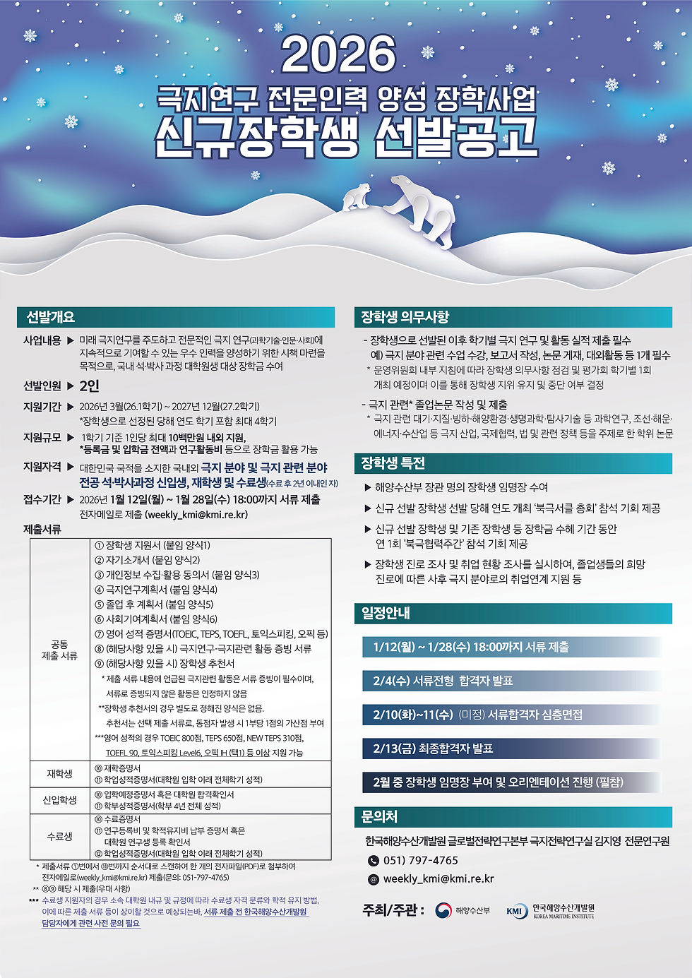신청 대상: 대한민국 국적을 소지한 국내외 극지 분야 및 극지 관련 분야 전공 석·박사과정 신입생, 재학생 및 수료 시점으로부터 2년이 경과하지 않은 수료생